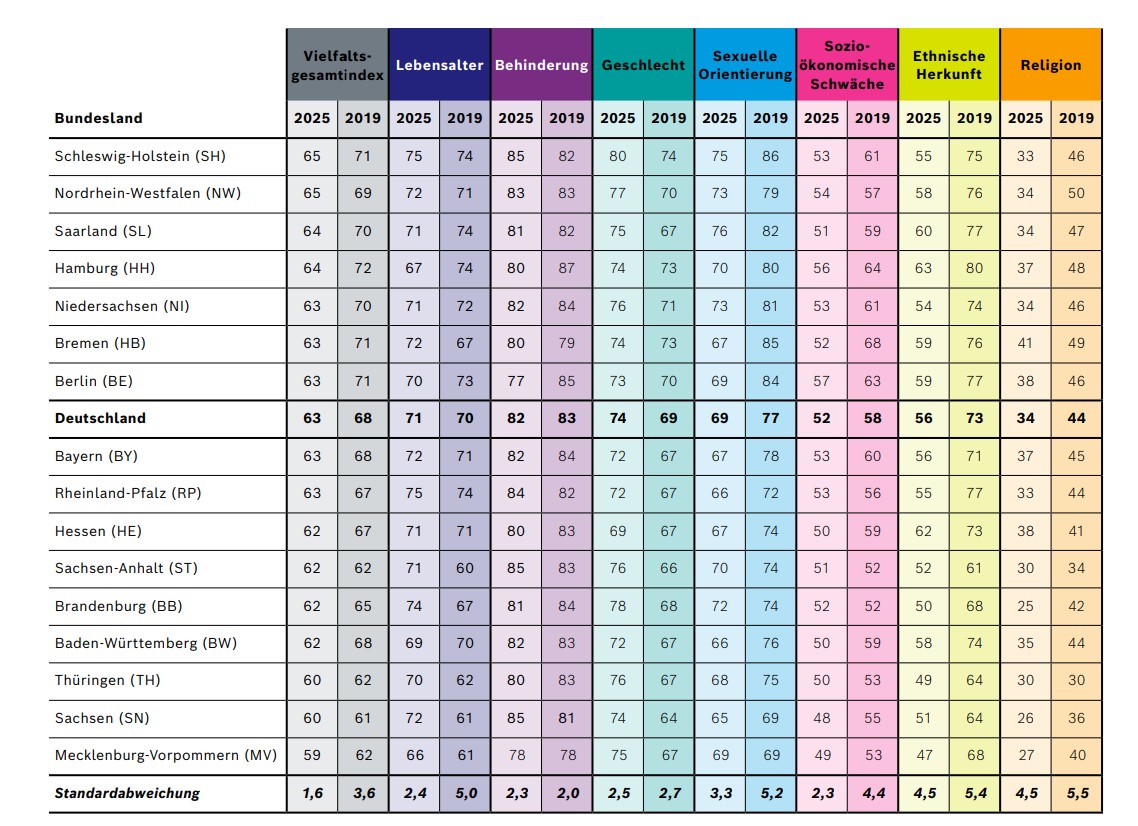 Während 2019, als die Befragung zuletzt durchgeführt wurde, 63 Prozent der Befragten die zunehmende Vielfalt eher oder sehr stark als Bereicherung erachteten, ist der Wert seitdem deutlich gesunken. 2025 sind es noch 45 Prozent. Im gleichen Zeitraum stieg der Anteil derjenigen, die Vielfalt als Bedrohung wahrnehmen, um 17 Prozent. Der Vielfaltsgesamtindex, der die Akzeptanz auf einer Skala von 0 bis 100 darstellt, ist von 68 Punkten auf 63 Punkte gesunken. Der Rückgang sei ein deutliches Signal für wachsende gesellschaftliche Spannungen, schreiben die Studienautoren.