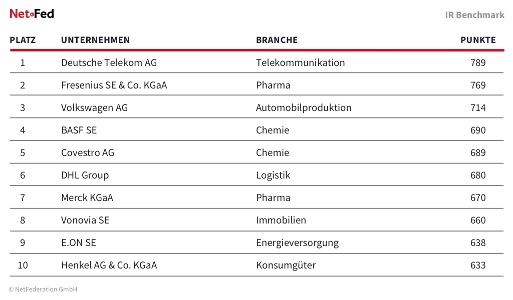 Die zehn bestplatzierten Unternehmen im „IR Benchmark“-Ranking. © Netfederation